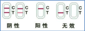 3.無效:控制區(C)無色帶出現。任何情況下,控制區(C)均應出現一條紫紅色條帶,如控制區無紫紅色條帶出現,表明發生操作錯誤或試劑盒變質失效,應重新檢測。